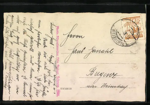 Personenbezogene Daten auf der Rückseite der Karte wurden durch blauen Textmarker unkenntlich gemacht. Die blauen Stellen sind auf die Vorderseite durchgeweicht und wirken sich negativ auf das Postkartenfoto aus
