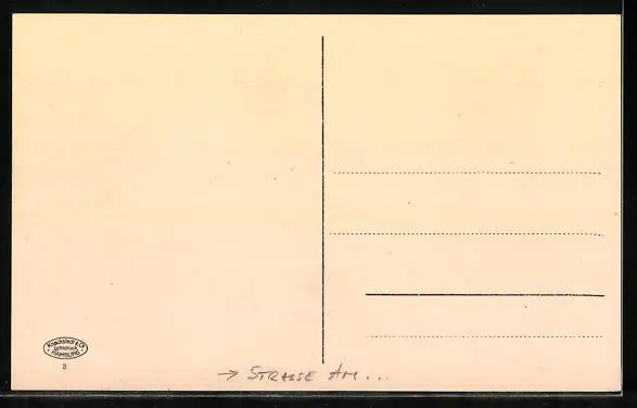 Personenbezogene Daten auf der Rückseite der Karte wurden durch blauen Textmarker unkenntlich gemacht. Die blauen Stellen sind auf die Vorderseite durchgeweicht und wirken sich negativ auf das Postkartenfoto aus