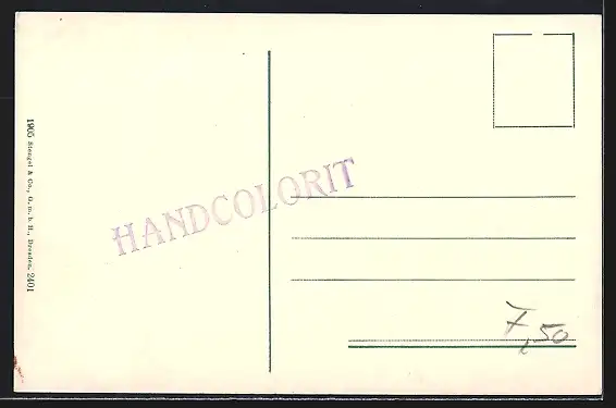 Personenbezogene Daten auf der Rückseite der Karte wurden durch blauen Textmarker unkenntlich gemacht. Die blauen Stellen sind auf die Vorderseite durchgeweicht und wirken sich negativ auf das Postkartenfoto aus