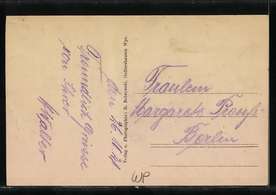 Personenbezogene Daten auf der Rückseite der Karte wurden durch blauen Textmarker unkenntlich gemacht. Die blauen Stellen sind auf die Vorderseite durchgeweicht und wirken sich negativ auf das Postkartenfoto aus