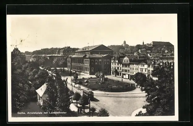 AK Gotha, Arnoldiplatz mit Landestheater und Strassenbahn