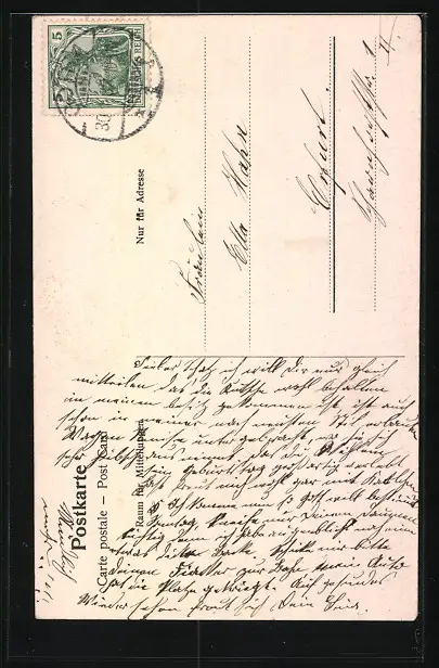 Personenbezogene Daten auf der Rückseite der Karte wurden durch blauen Textmarker unkenntlich gemacht. Die blauen Stellen sind auf die Vorderseite durchgeweicht und wirken sich negativ auf das Postkartenfoto aus