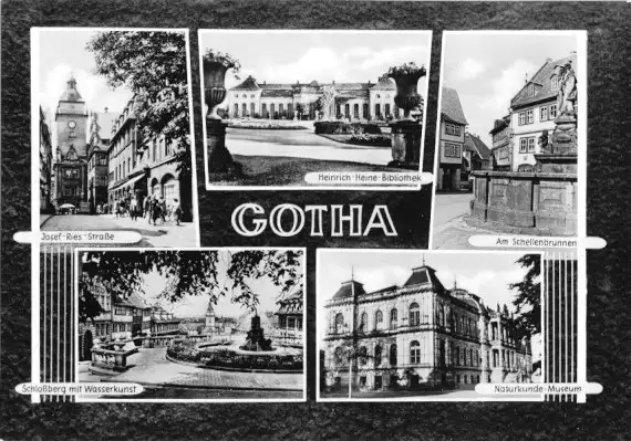 Ansichtskarte Gotha fünf Abb., gestaltet Josef-Ries-Str., Heinrich-Heine-Bibliothek, Am Schellenbrunnen, Schloßberg mit Wasserkunst, Naturkunde-Museum Erhaltung I ungelaufen Druckvermerk: 1964 Herstellungsland: DDR Verlag: KONSUM FOKU Magdeburg - A2984