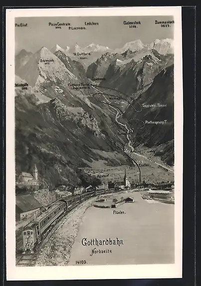 AK Gotthardbahn mit der Strecke auf der Nordseite des Gotthard