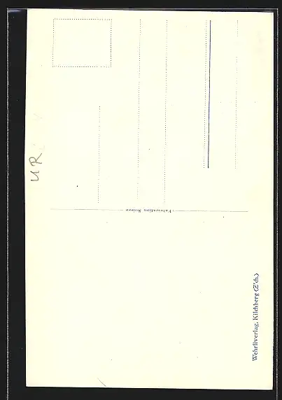 Personenbezogene Daten auf der Rückseite der Karte wurden durch blauen Textmarker unkenntlich gemacht. Die blauen Stellen sind auf die Vorderseite durchgeweicht und wirken sich negativ auf das Postkartenfoto aus