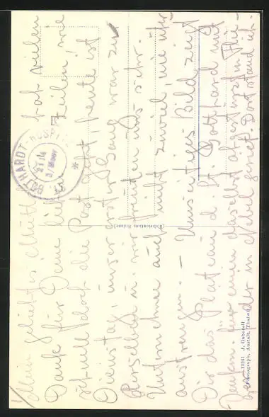 Personenbezogene Daten auf der Rückseite der Karte wurden durch blauen Textmarker unkenntlich gemacht. Die blauen Stellen sind auf die Vorderseite durchgeweicht und wirken sich negativ auf das Postkartenfoto aus