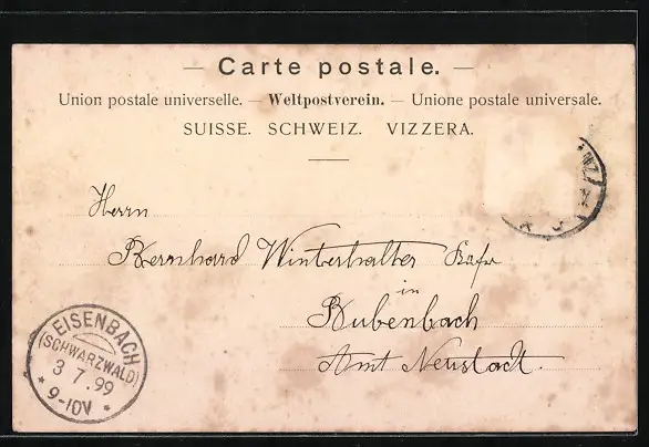 alte Ansichtskarte, gelaufen 1899, Briefmarke entfernt, rückseitig Oberflächenschaden, leicht fleckig, guter Zustand