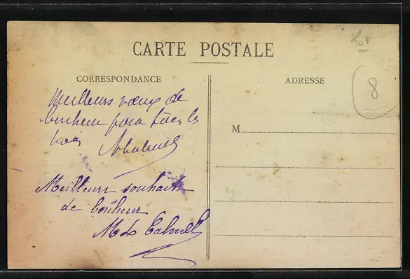 Personenbezogene Daten auf der Rückseite der Karte wurden durch blauen Textmarker unkenntlich gemacht. Die blauen Stellen sind auf die Vorderseite durchgeweicht und wirken sich negativ auf das Postkartenfoto aus