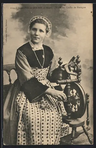 AK Gourin, Bretonin in Tracht mit Spindel
