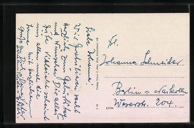 Personenbezogene Daten auf der Rückseite der Karte wurden durch blauen Textmarker unkenntlich gemacht. Die blauen Stellen sind auf die Vorderseite durchgeweicht und wirken sich negativ auf das Postkartenfoto aus