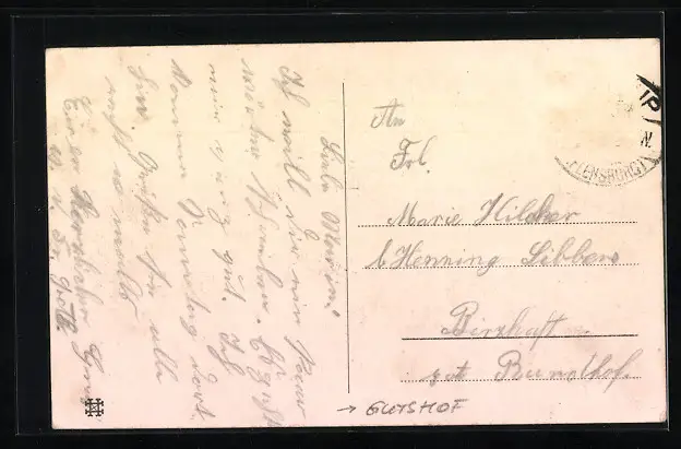 Personenbezogene Daten auf der Rückseite der Karte wurden durch blauen Textmarker unkenntlich gemacht. Die blauen Stellen sind auf die Vorderseite durchgeweicht und wirken sich negativ auf das Postkartenfoto aus