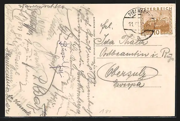 Personenbezogene Daten auf der Rückseite der Karte wurden durch blauen Textmarker unkenntlich gemacht. Die blauen Stellen sind auf die Vorderseite durchgeweicht und wirken sich negativ auf das Postkartenfoto aus