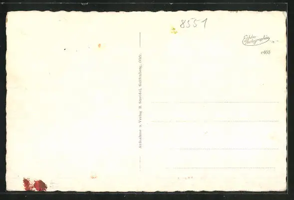 Personenbezogene Daten auf der Rückseite der Karte wurden durch blauen Textmarker unkenntlich gemacht. Die blauen Stellen sind auf die Vorderseite durchgeweicht und wirken sich negativ auf das Postkartenfoto aus