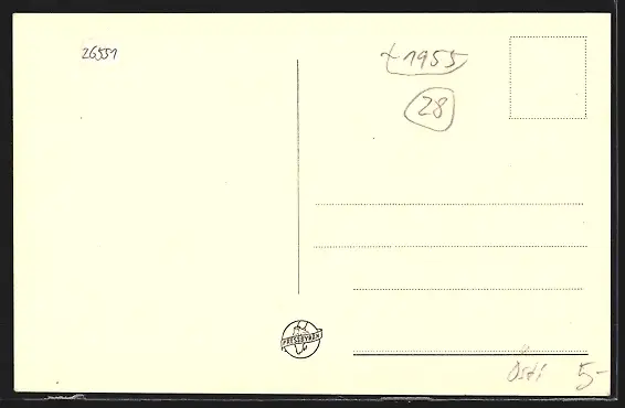 Personenbezogene Daten auf der Rückseite der Karte wurden durch blauen Textmarker unkenntlich gemacht. Die blauen Stellen sind auf die Vorderseite durchgeweicht und wirken sich negativ auf das Postkartenfoto aus