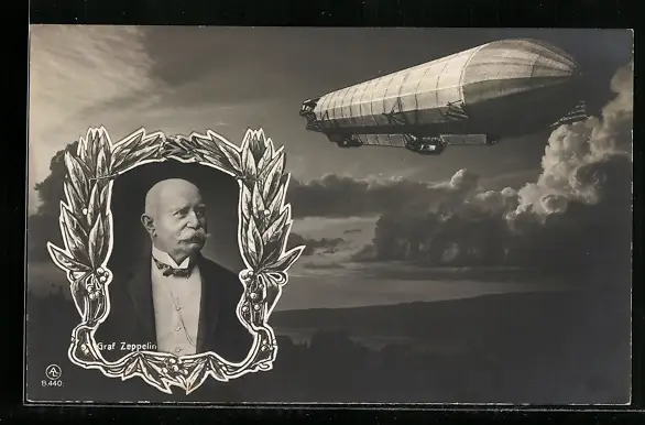 AK Graf Zeppelin im Portrait im Lorbeerkranz, Luftschiff im Himmel