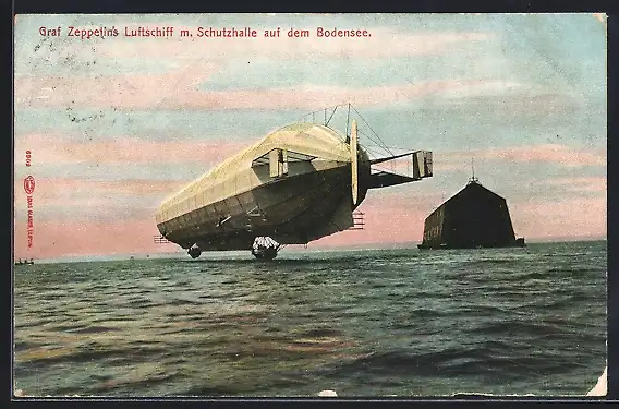 AK Graf Zeppelins Luftschiff mit Schutzhalle auf dem Bodensee