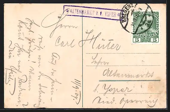Personenbezogene Daten auf der Rückseite der Karte wurden durch blauen Textmarker unkenntlich gemacht. Die blauen Stellen sind auf die Vorderseite durchgeweicht und wirken sich negativ auf das Postkartenfoto aus
