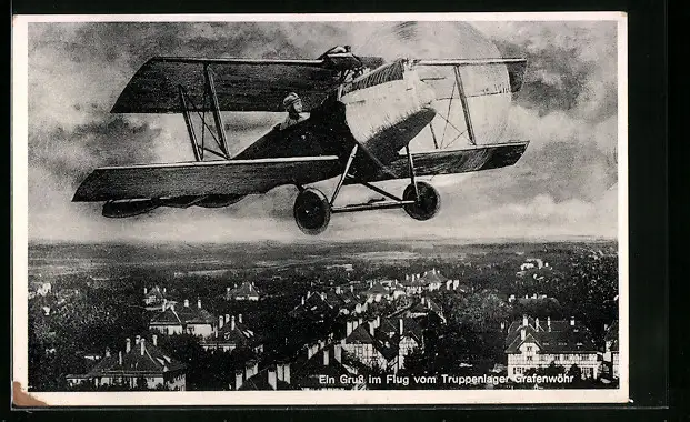 AK Grafenwöhr, Doppeldecker-Flugzeug über der Stadt