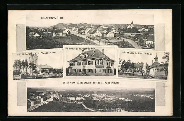 AK Grafenwöhr, Generalansicht, Kommandanturgebäude, Blick vom Wasserturm auf das Truppenlager, Militärgasthof und Wache