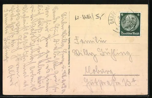 Personenbezogene Daten auf der Rückseite der Karte wurden durch blauen Textmarker unkenntlich gemacht. Die blauen Stellen sind auf die Vorderseite durchgeweicht und wirken sich negativ auf das Postkartenfoto aus