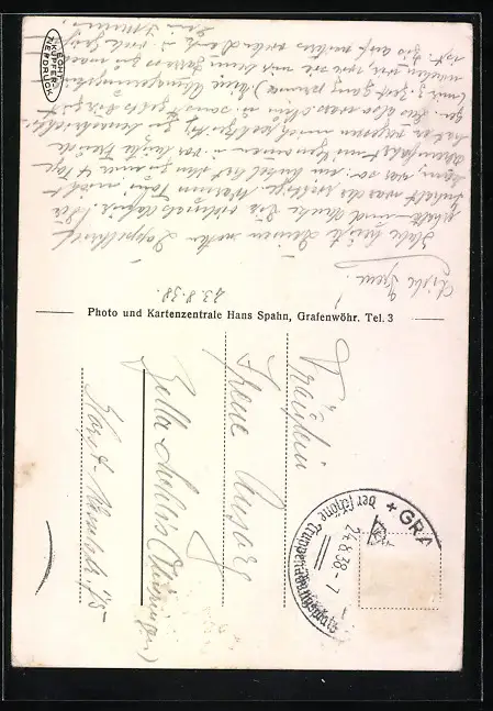 Personenbezogene Daten auf der Rückseite der Karte wurden durch blauen Textmarker unkenntlich gemacht. Die blauen Stellen sind auf die Vorderseite durchgeweicht und wirken sich negativ auf das Postkartenfoto aus