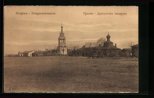 AK Grajewo, Dragonerkaserne mit Kirchen, gesehen von einer Freifläche