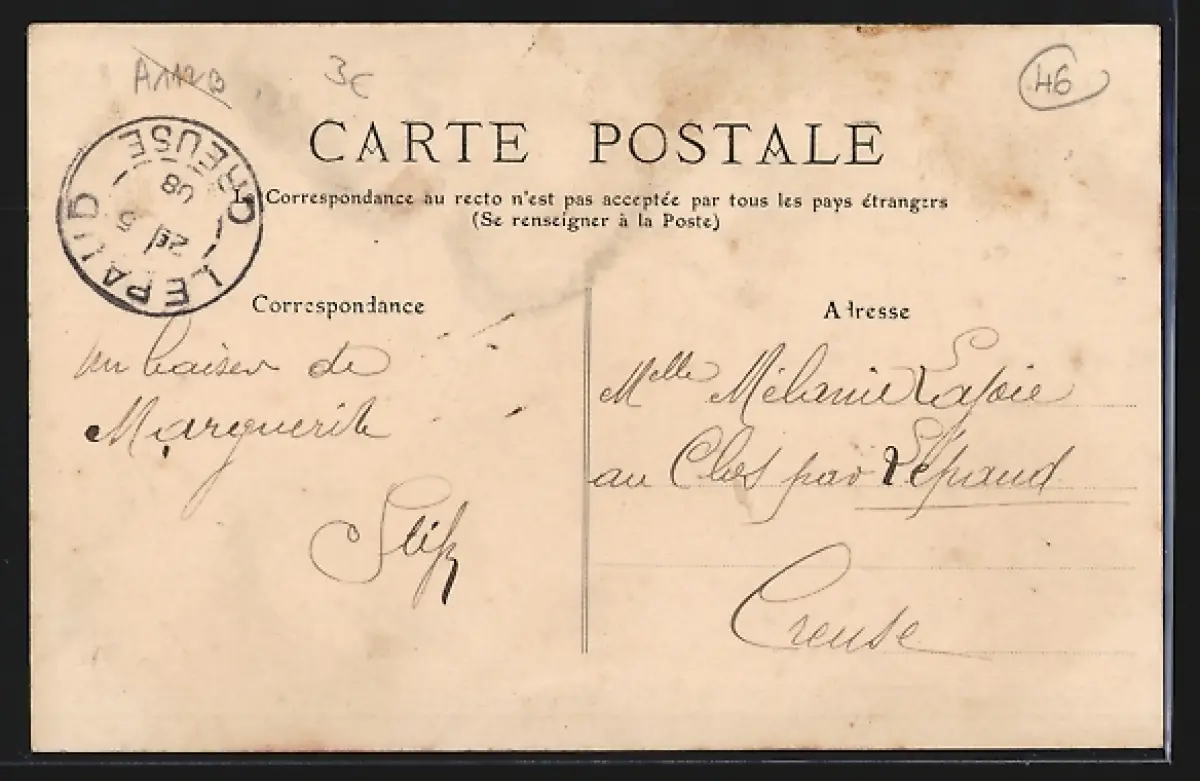 Personenbezogene Daten auf der Rückseite der Karte wurden durch blauen Textmarker unkenntlich gemacht. Die blauen Stellen sind auf die Vorderseite durchgeweicht und wirken sich negativ auf das Postkartenfoto aus