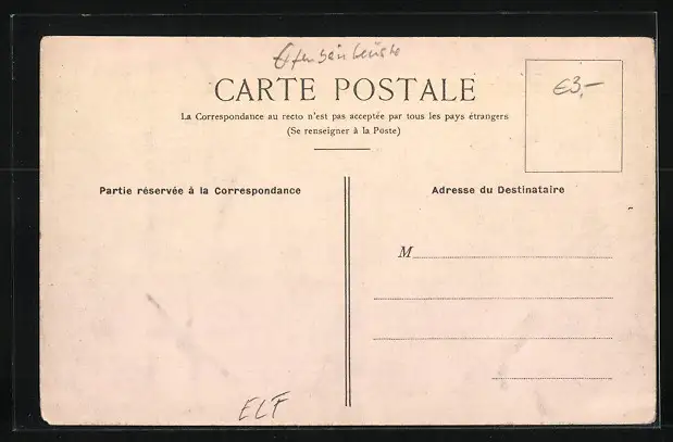 Personenbezogene Daten auf der Rückseite der Karte wurden durch blauen Textmarker unkenntlich gemacht. Die blauen Stellen sind auf die Vorderseite durchgeweicht und wirken sich negativ auf das Postkartenfoto aus