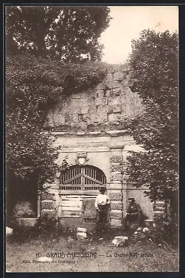 AK Grand-Pressigny, La Grotte XVIe siècle avec deux hommes devant l`entrée