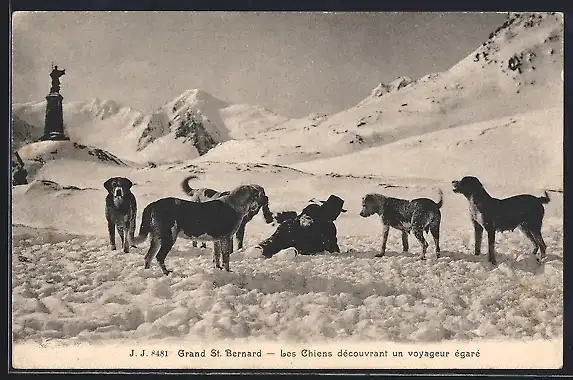 AK Grand St. Bernard, Ansicht eines im Schnee liegenden Mannes von Bernhardinern umringt