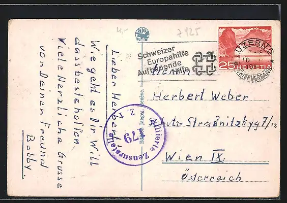 Personenbezogene Daten auf der Rückseite der Karte wurden durch blauen Textmarker unkenntlich gemacht. Die blauen Stellen sind auf die Vorderseite durchgeweicht und wirken sich negativ auf das Postkartenfoto aus