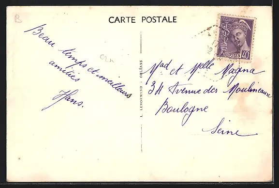 Personenbezogene Daten auf der Rückseite der Karte wurden durch blauen Textmarker unkenntlich gemacht. Die blauen Stellen sind auf die Vorderseite durchgeweicht und wirken sich negativ auf das Postkartenfoto aus