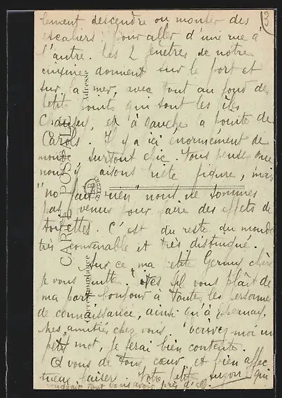 Personenbezogene Daten auf der Rückseite der Karte wurden durch blauen Textmarker unkenntlich gemacht. Die blauen Stellen sind auf die Vorderseite durchgeweicht und wirken sich negativ auf das Postkartenfoto aus