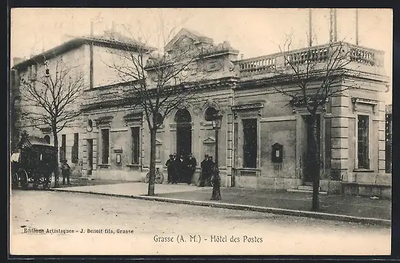 AK Grasse, Hôtel des Postes, fiacre, hommes devant l`entrée