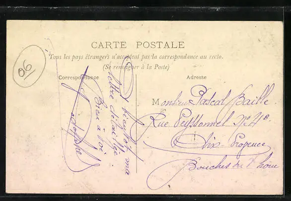 Personenbezogene Daten auf der Rückseite der Karte wurden durch blauen Textmarker unkenntlich gemacht. Die blauen Stellen sind auf die Vorderseite durchgeweicht und wirken sich negativ auf das Postkartenfoto aus