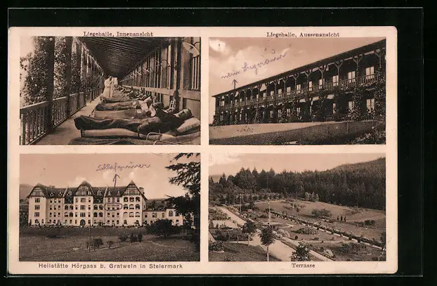 AK Gratwein, Heilstätte Hörgass, Liegehalle, Terrasse, Gebäudeansicht