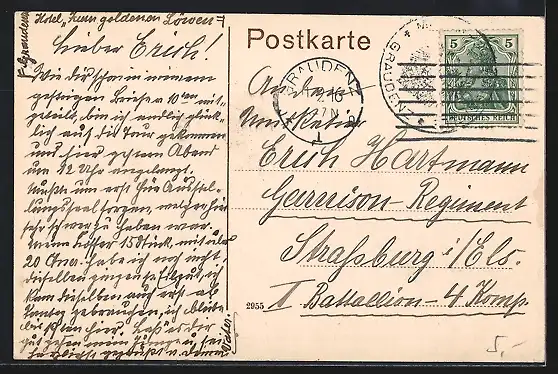 alte Ansichtskarte, gelaufen 1916, Oberflächenschaden li. oben, guter Zustand