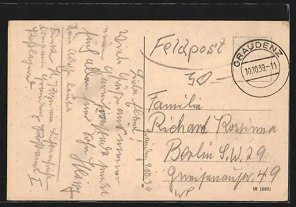 Personenbezogene Daten auf der Rückseite der Karte wurden durch blauen Textmarker unkenntlich gemacht. Die blauen Stellen sind auf die Vorderseite durchgeweicht und wirken sich negativ auf das Postkartenfoto aus