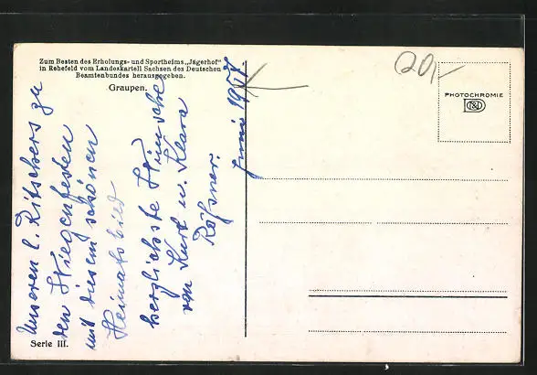 Personenbezogene Daten auf der Rückseite der Karte wurden durch blauen Textmarker unkenntlich gemacht. Die blauen Stellen sind auf die Vorderseite durchgeweicht und wirken sich negativ auf das Postkartenfoto aus