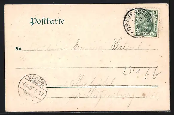 Personenbezogene Daten auf der Rückseite der Karte wurden durch blauen Textmarker unkenntlich gemacht. Die blauen Stellen sind auf die Vorderseite durchgeweicht und wirken sich negativ auf das Postkartenfoto aus