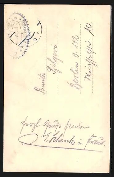 Personenbezogene Daten auf der Rückseite der Karte wurden durch blauen Textmarker unkenntlich gemacht. Die blauen Stellen sind auf die Vorderseite durchgeweicht und wirken sich negativ auf das Postkartenfoto aus