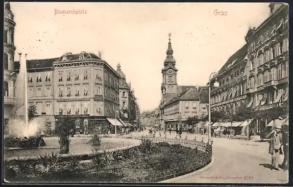 AK Graz, Bismarckplatz, Ortspartie mit Kirchturm