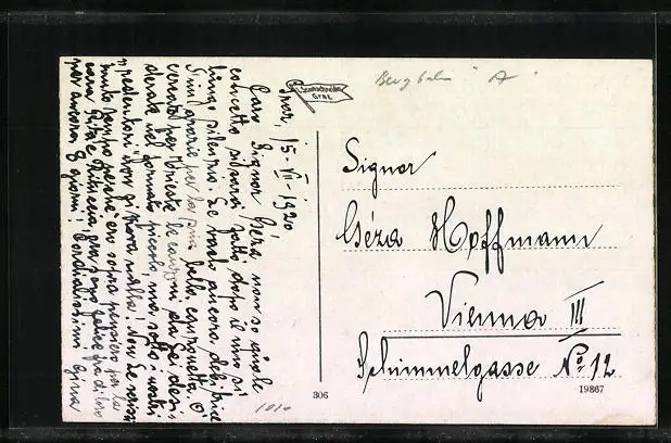 Personenbezogene Daten auf der Rückseite der Karte wurden durch blauen Textmarker unkenntlich gemacht. Die blauen Stellen sind auf die Vorderseite durchgeweicht und wirken sich negativ auf das Postkartenfoto aus