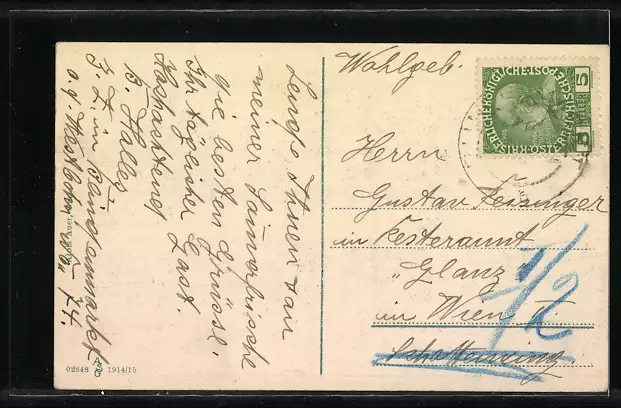 Personenbezogene Daten auf der Rückseite der Karte wurden durch blauen Textmarker unkenntlich gemacht. Die blauen Stellen sind auf die Vorderseite durchgeweicht und wirken sich negativ auf das Postkartenfoto aus