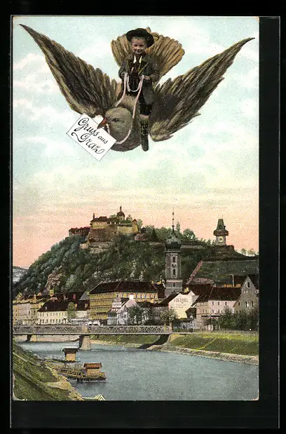 AK Graz, Flusspartie in der Stadt, Bub fliegt auf einer Brieftaube