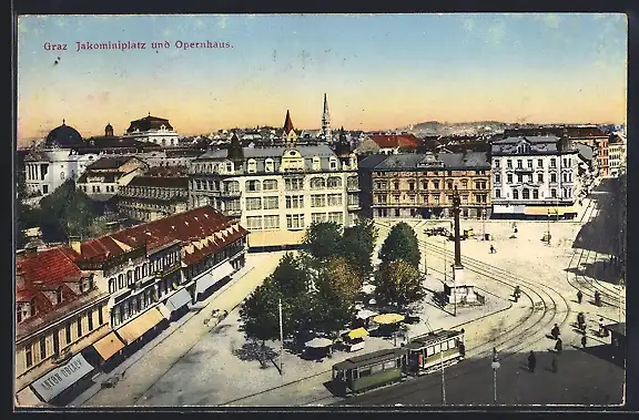 AK Graz, Jakominiplatz mit Geschäften, Strassenbahn und Opernhaus