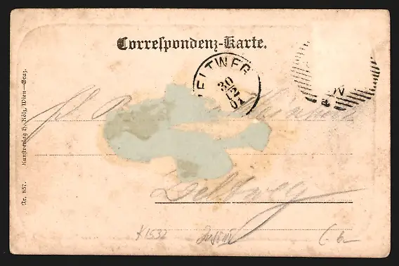 Personenbezogene Daten auf der Rückseite der Karte wurden durch blauen Textmarker unkenntlich gemacht. Die blauen Stellen sind auf die Vorderseite durchgeweicht und wirken sich negativ auf das Postkartenfoto aus