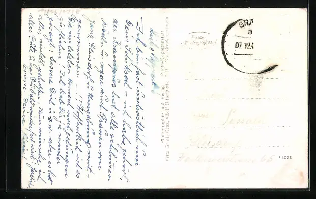 Personenbezogene Daten auf der Rückseite der Karte wurden durch blauen Textmarker unkenntlich gemacht. Die blauen Stellen sind auf die Vorderseite durchgeweicht und wirken sich negativ auf das Postkartenfoto aus