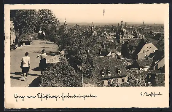 AK Graz, Panoramablick mit zwei Frauen vom Schlossberg