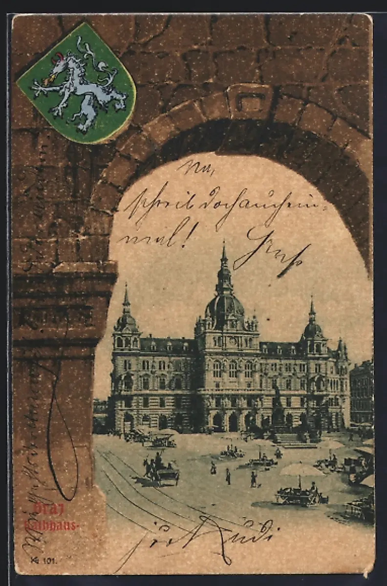 AK Graz, Rathaus unter einem Torbogen, Wappen